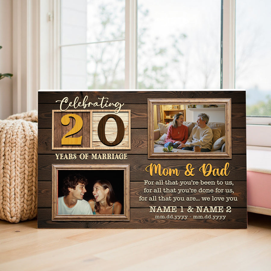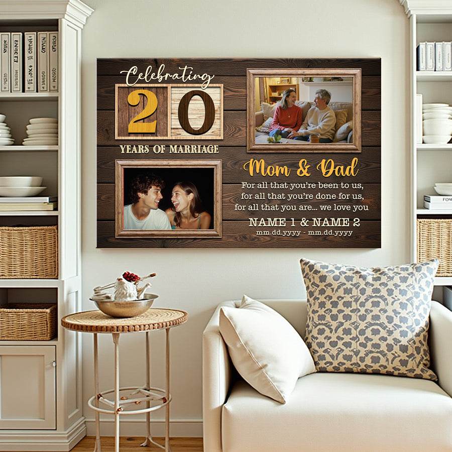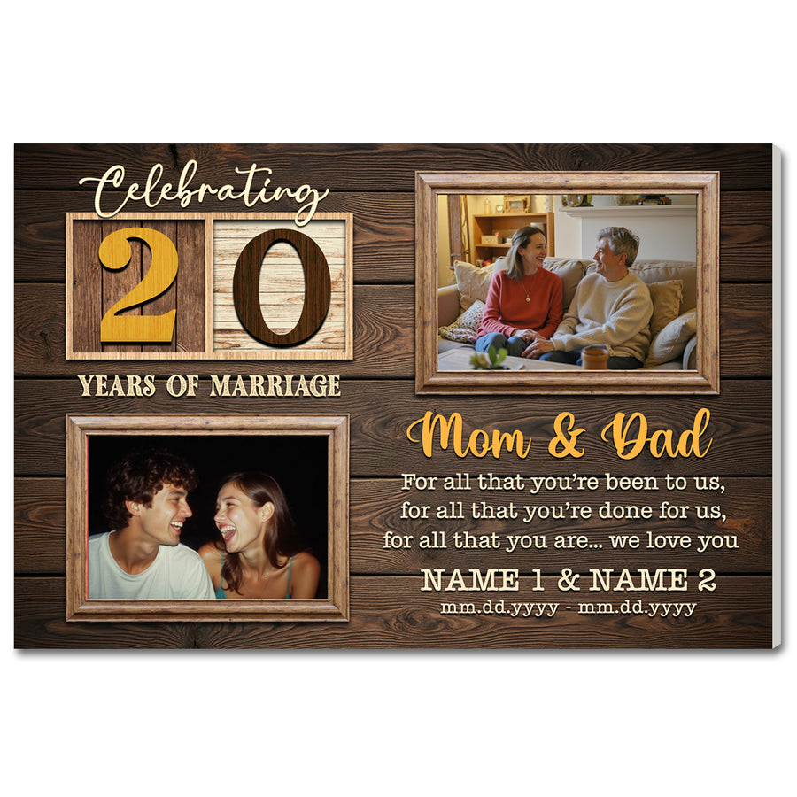 Celebrate 20 years of marriage with this personalized canvas, a heartfelt gift that beautifully captures the journey of two hearts. Perfect for anniversaries or special occasions.