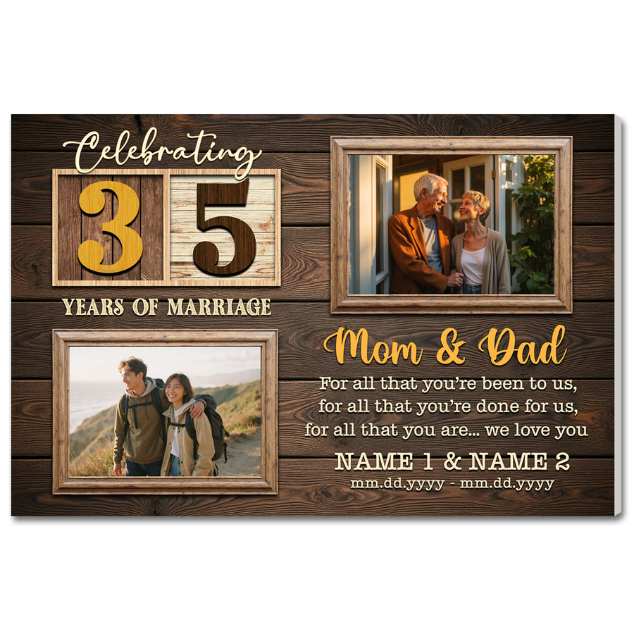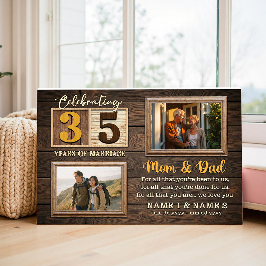 Celebrate 35 years of marriage with this personalized canvas, a heartfelt gift that beautifully captures the journey of two hearts. Perfect for anniversaries or special occasions.