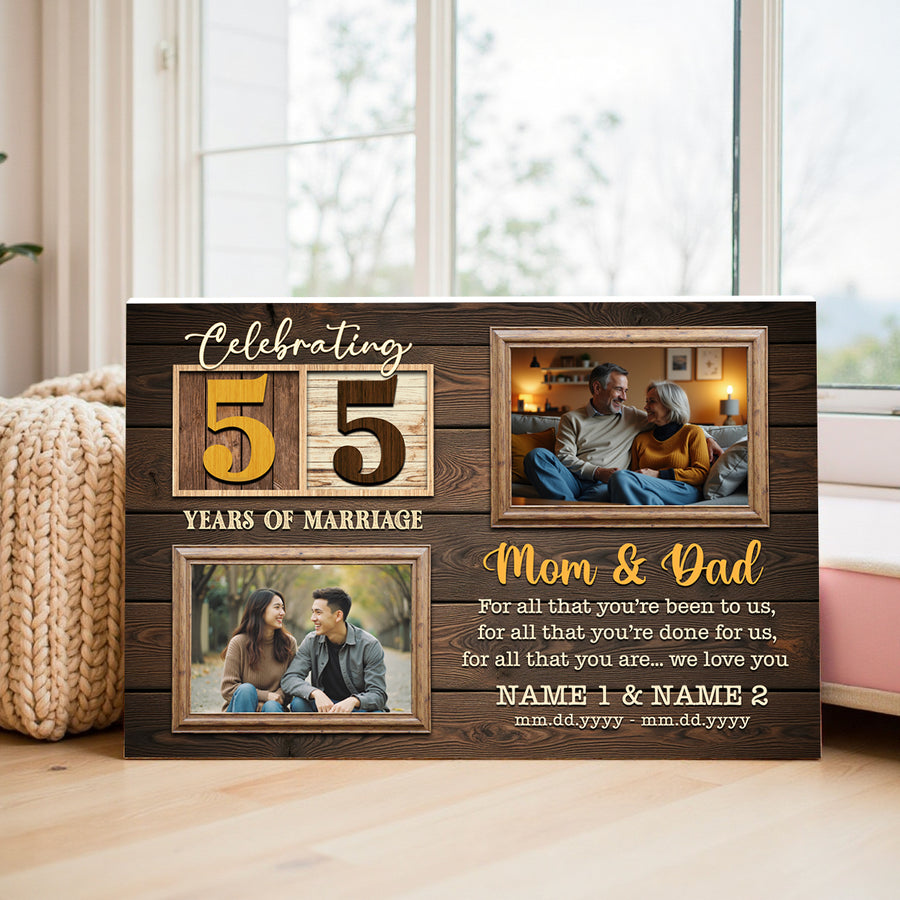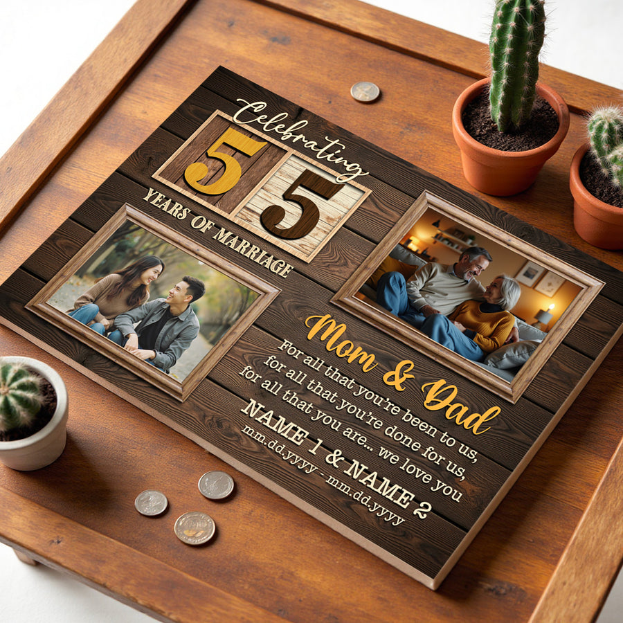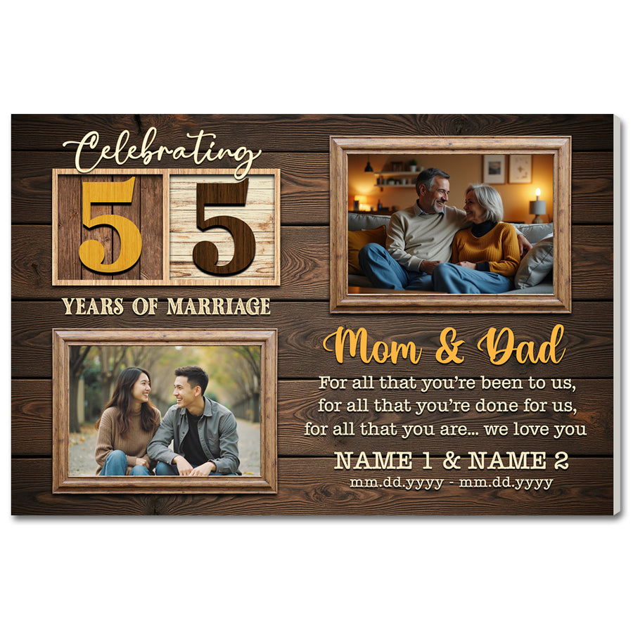 Celebrate 55 years of marriage with this personalized canvas, a heartfelt gift that beautifully captures the journey of two hearts. Perfect for anniversaries or special occasions.