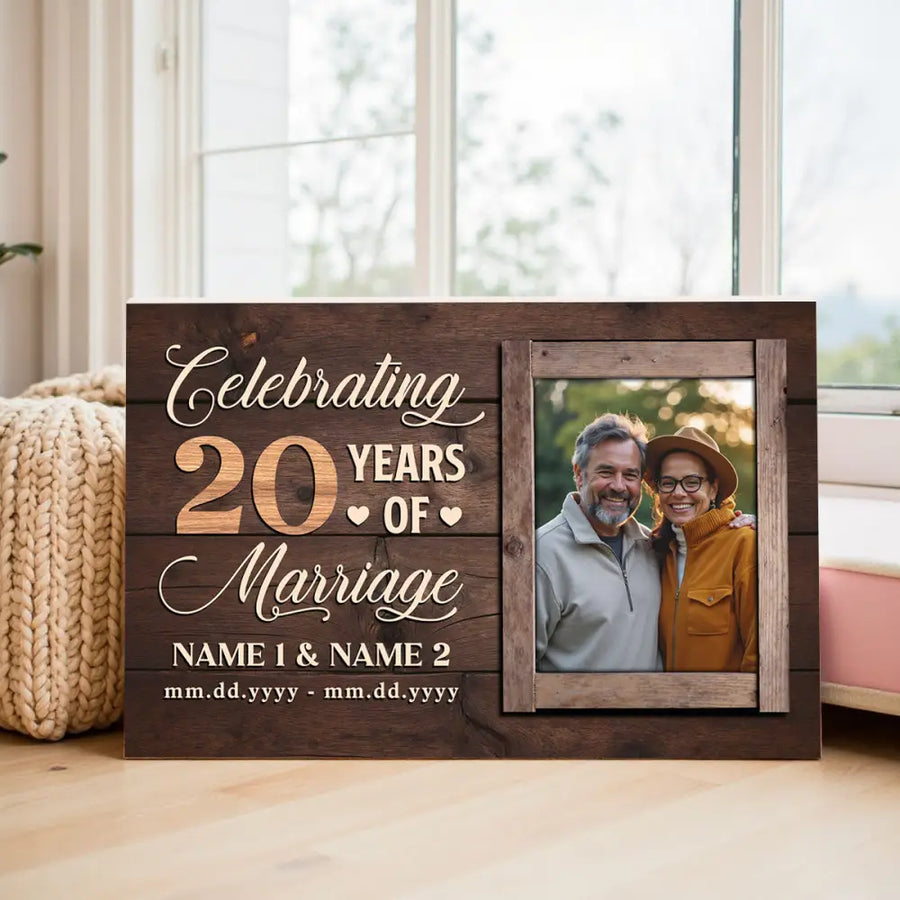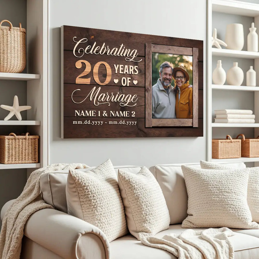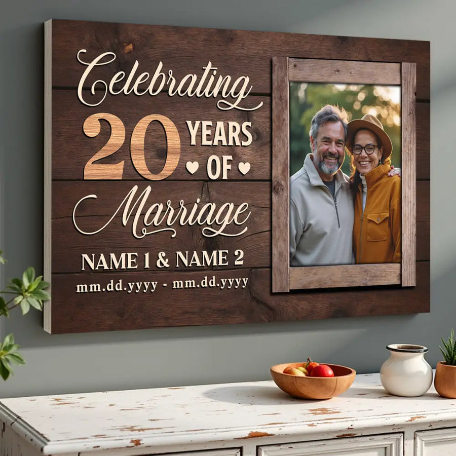Commemorate 20 years of marriage with this personalized canvas, a timeless keepsake that celebrates the beautiful journey of two hearts. Ideal for anniversaries or special moments.