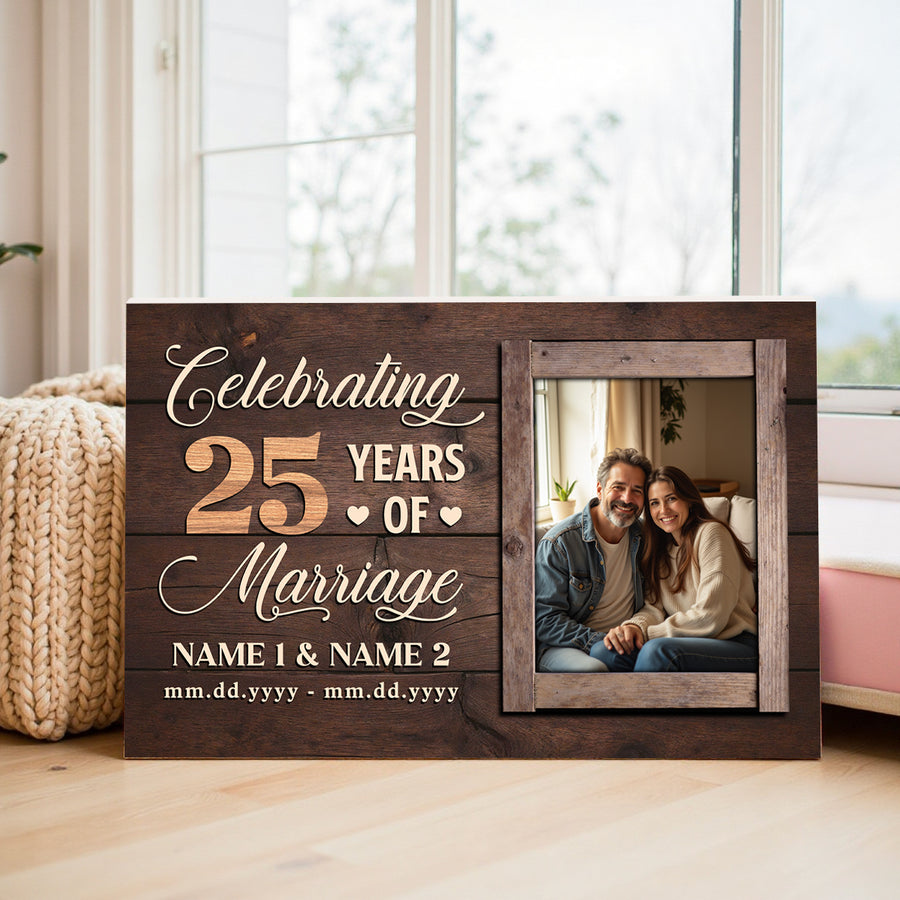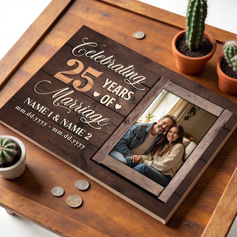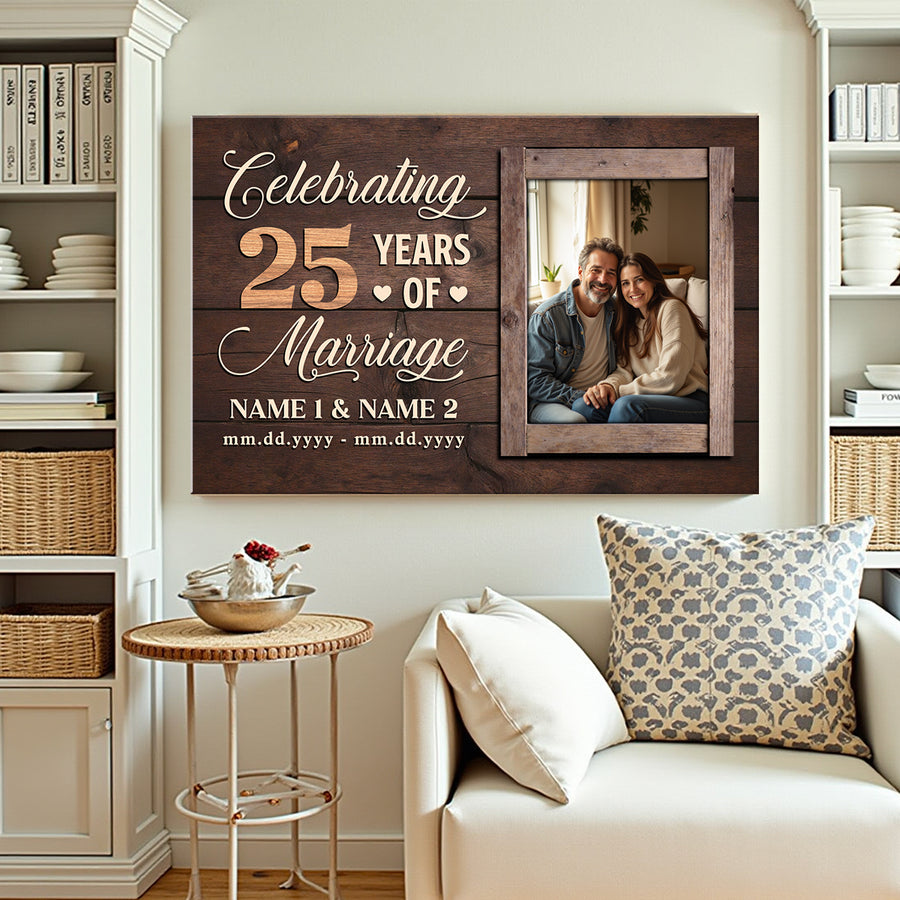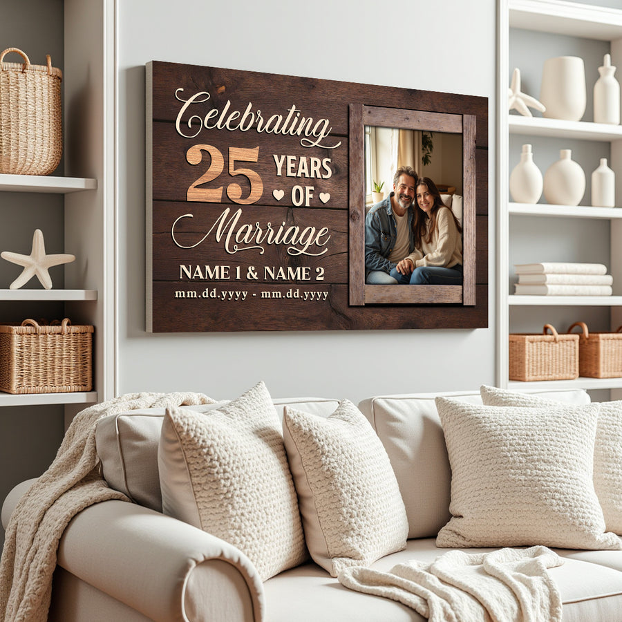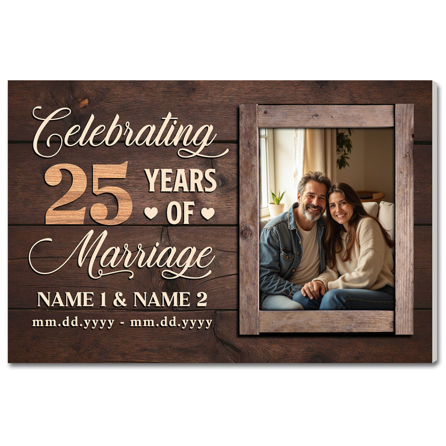 Commemorate 25 years of marriage with this personalized canvas, a timeless keepsake that celebrates the beautiful journey of two hearts. Ideal for anniversaries or special moments.