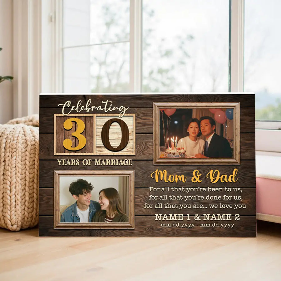 Celebrate 30 years of marriage with this personalized canvas, a heartfelt gift that beautifully captures the journey of two hearts. Perfect for anniversaries or special occasions.