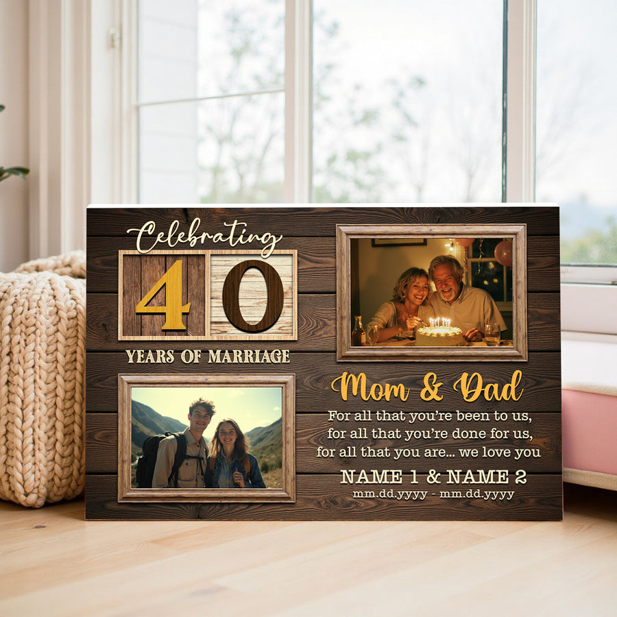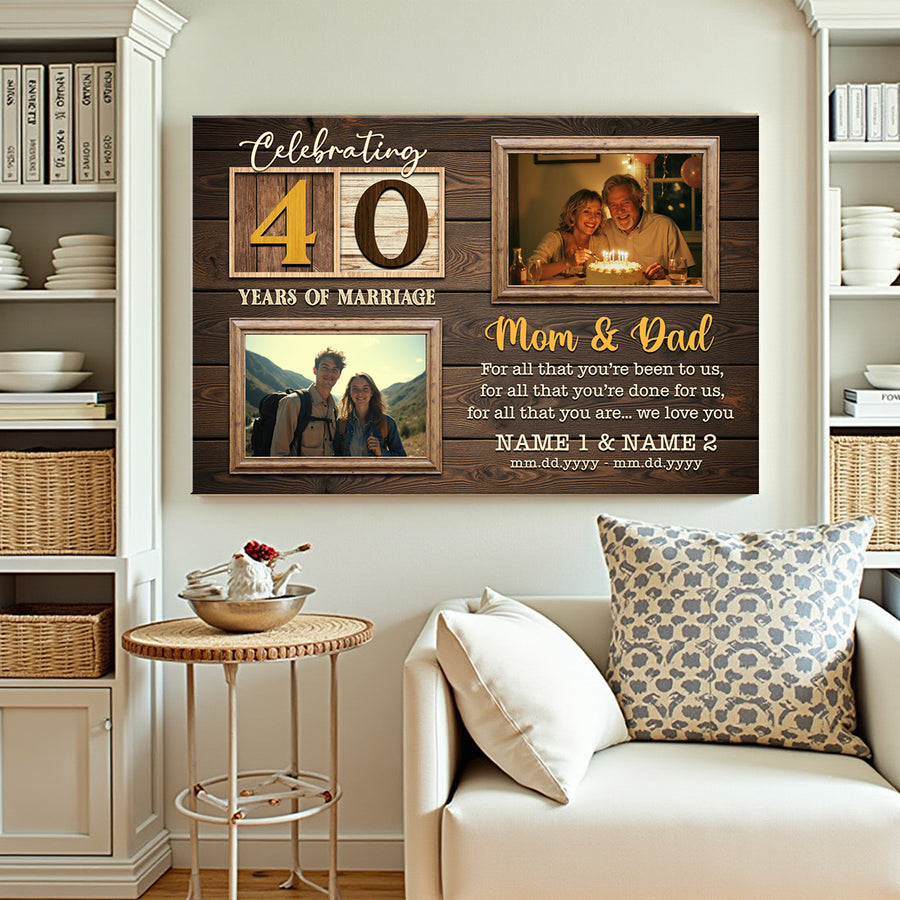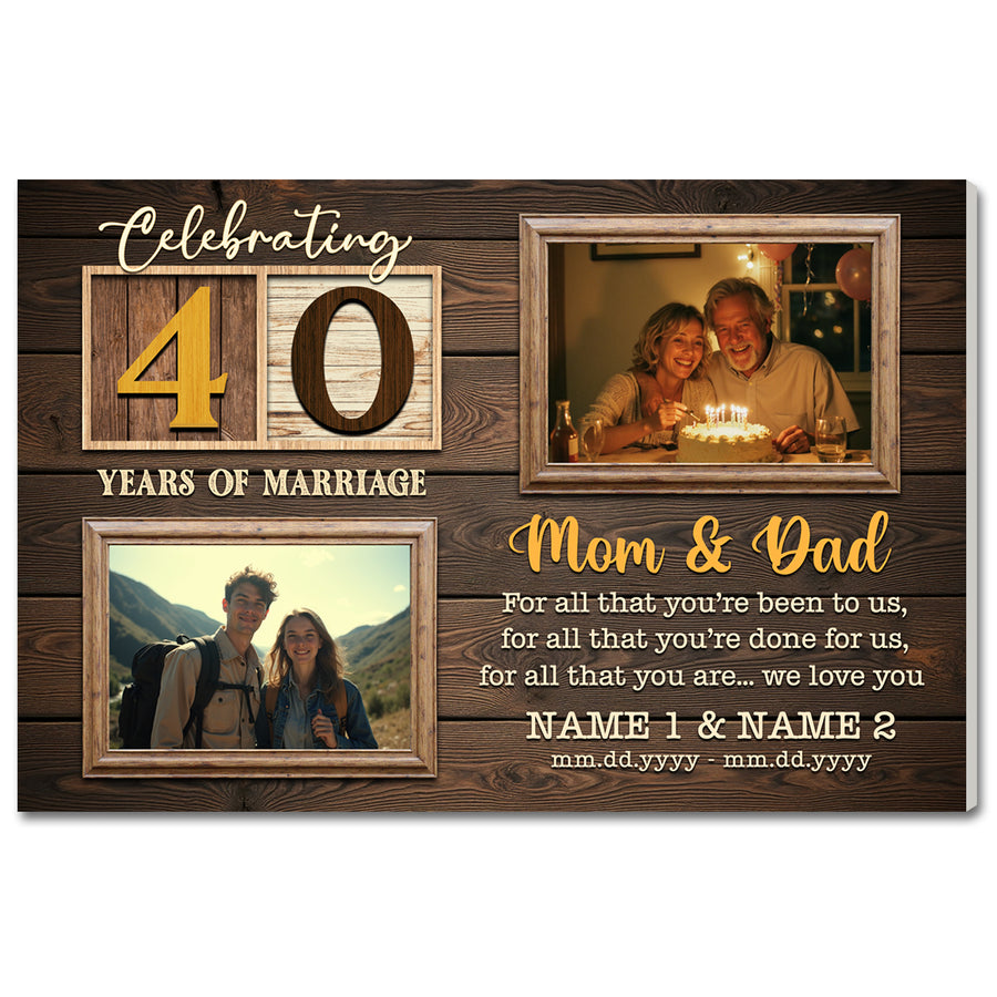Celebrate 40 years of marriage with this personalized canvas, a heartfelt gift that beautifully captures the journey of two hearts. Perfect for anniversaries or special occasions.