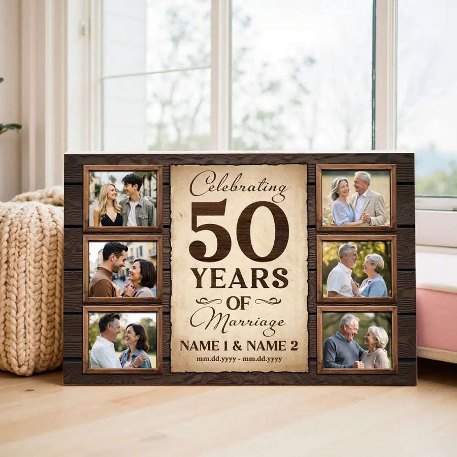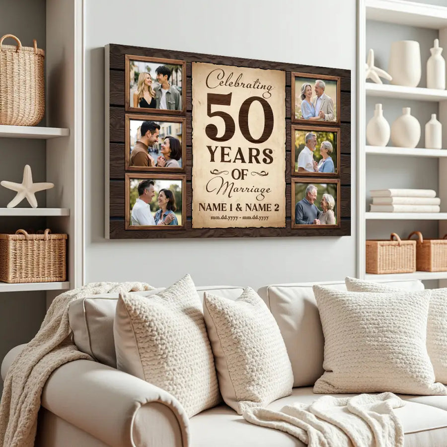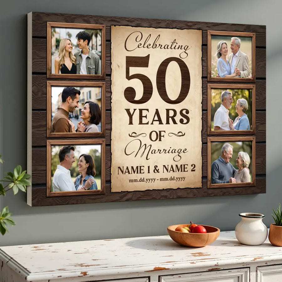 Celebrate a lifetime of love with this personalized canvas featuring the heartfelt message Celebrating 50 Years Of Marriage. A meaningful gift that captures the journey of two hearts, perfect for anniversaries, weddings, or any special day.