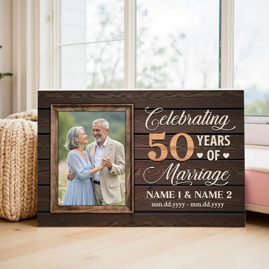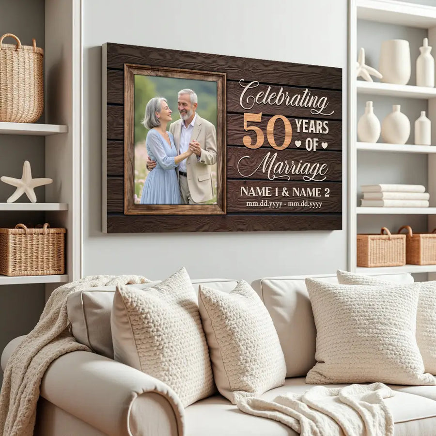 Celebrate a lifetime of love with this personalized canvas featuring the heartfelt message Celebrating 50 Years Of Marriage. A meaningful gift that captures the journey of two hearts, perfect for anniversaries, weddings, or any special day.