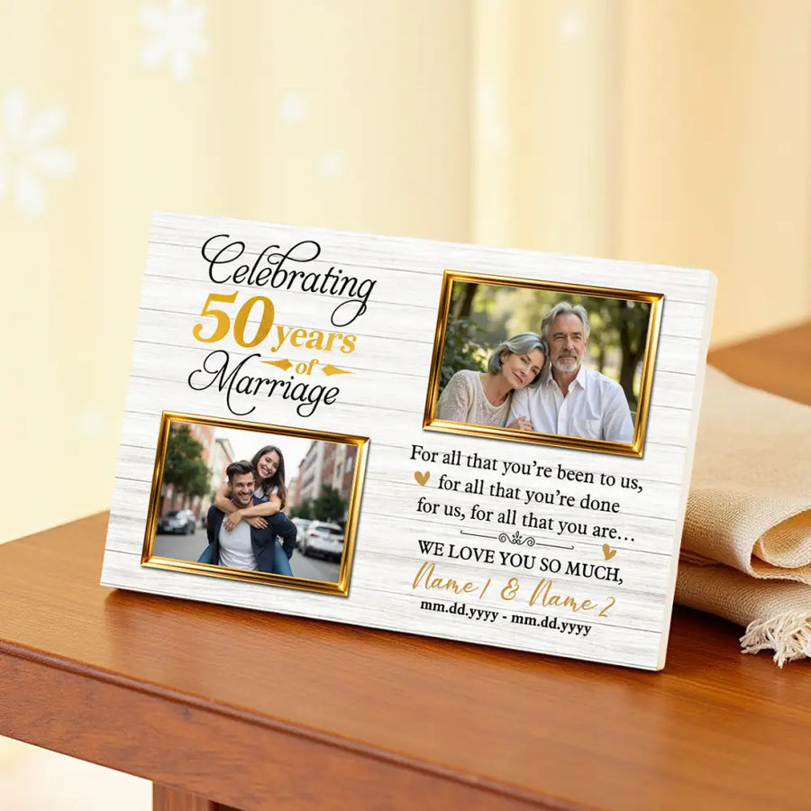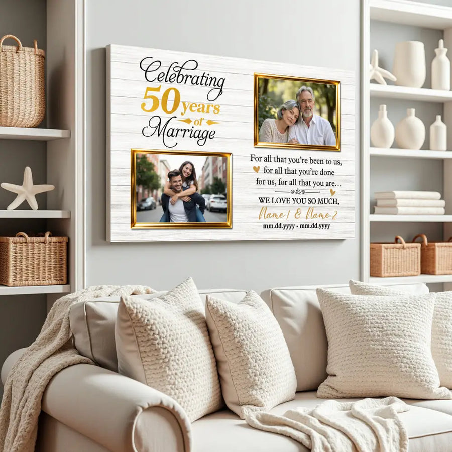 Celebrate a lifetime of love with this personalized canvas featuring the heartfelt message Celebrating 50 Years Of Marriage. A meaningful gift that captures the journey of two hearts, perfect for anniversaries, weddings, or any special day.