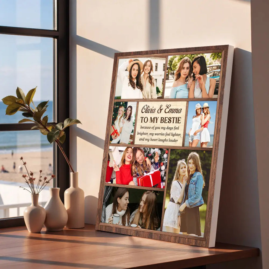 Celebrate your closest friend with this personalized To My Bestie canvas, created with custom photos and warm, expressive details. The design captures the bond of best friends, the joy of girlhood friendships, and the beautiful moments shared between BFFs. Personalize it with names, dates, or heartfelt notes to create a meaningful gift for birthdays, friendship celebrations, or any special moment for your best friend.