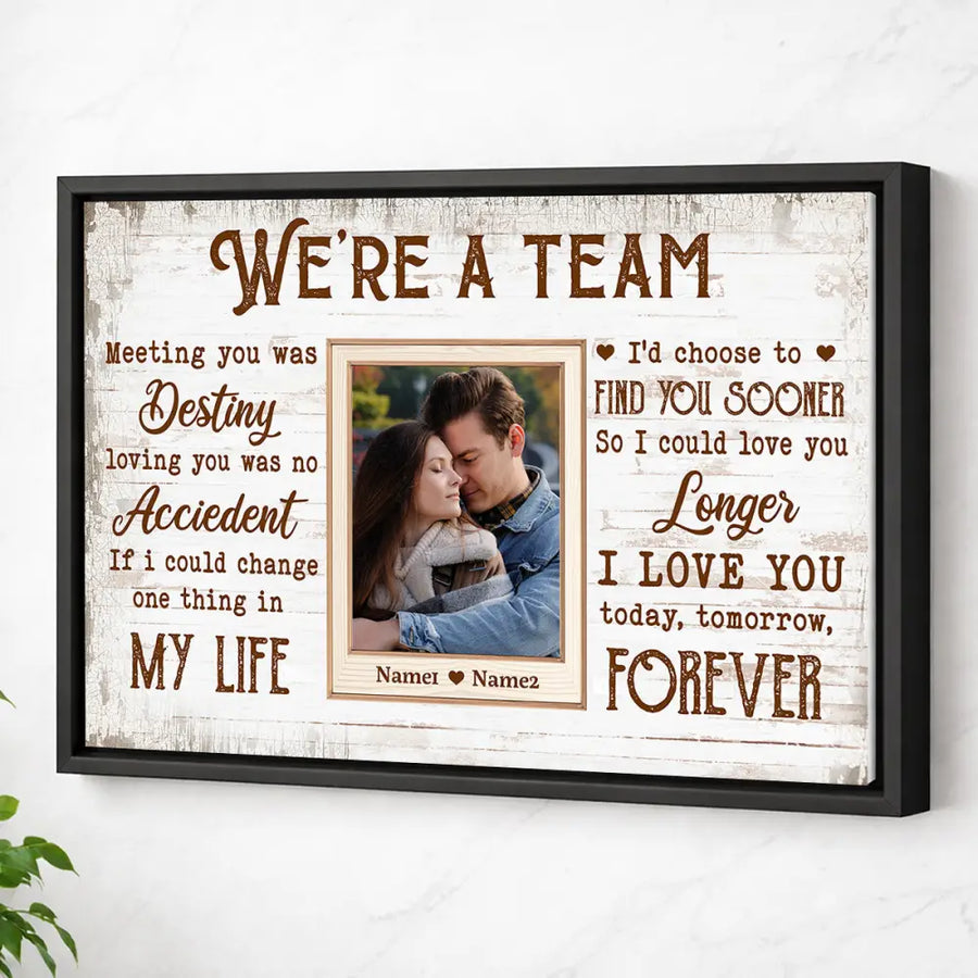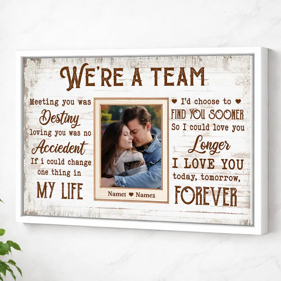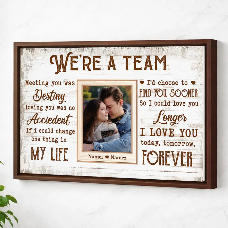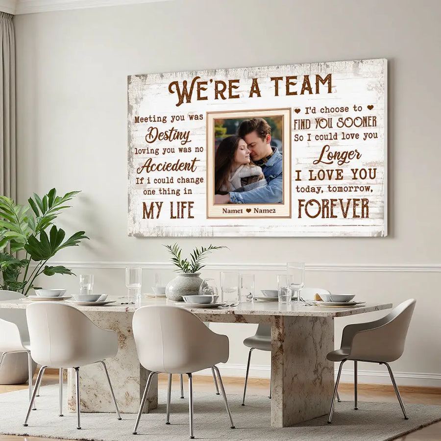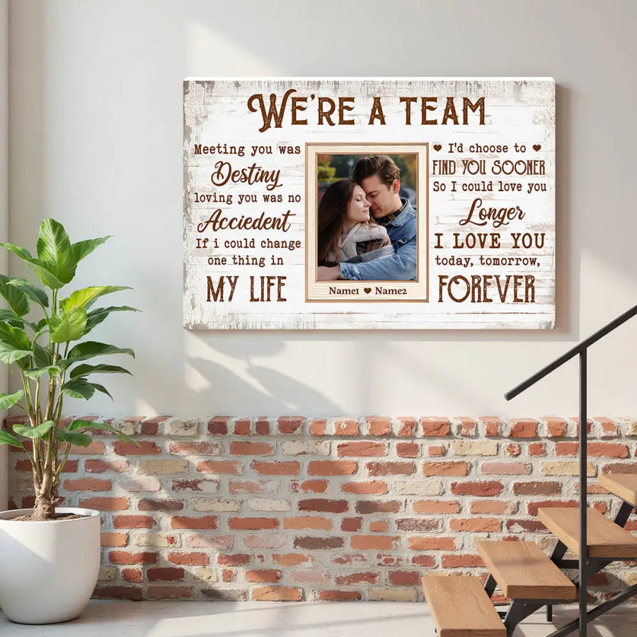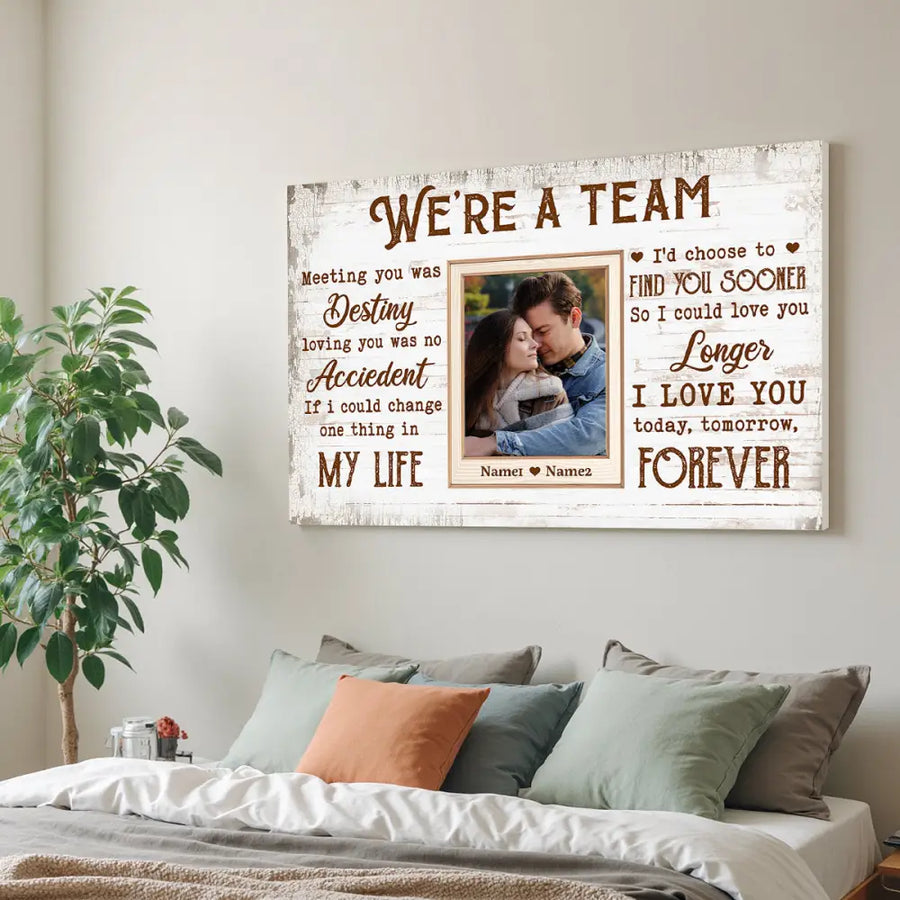 Celebrate love and togetherness with a personalized canvas featuring your custom photo and the message we’re a team, a meaningful anniversary gift for husband and wife that reflects partnership and connection, a couple canvas wall art idea designed to add warmth and emotion to home decor