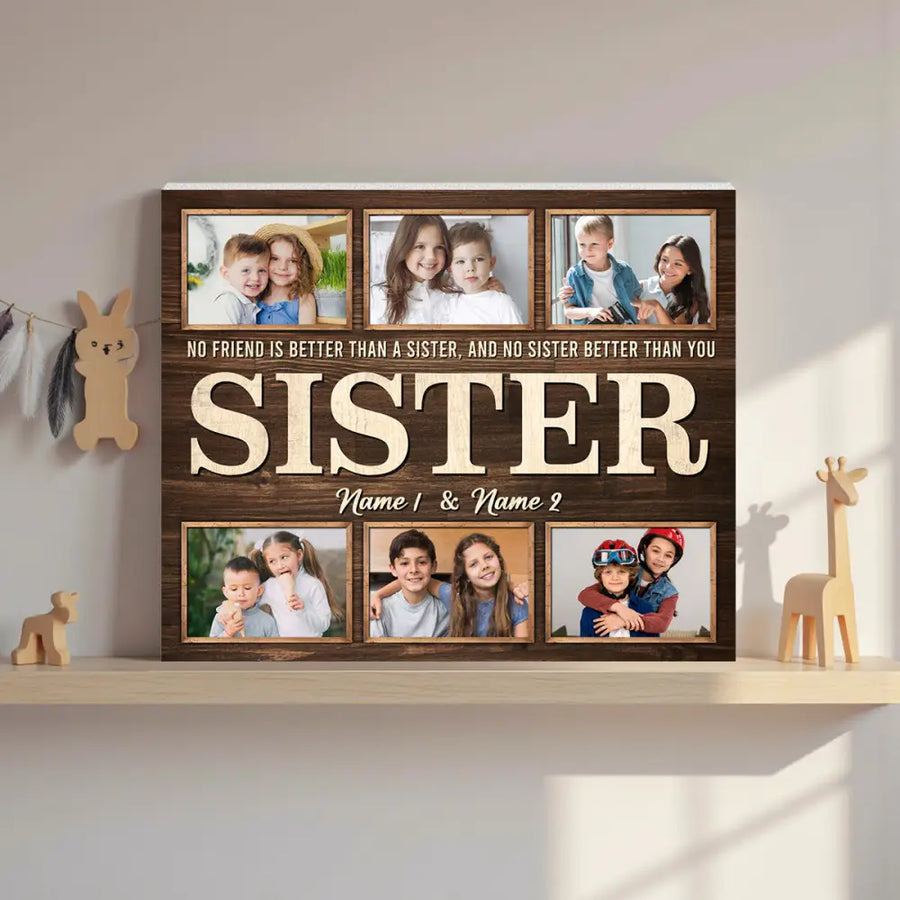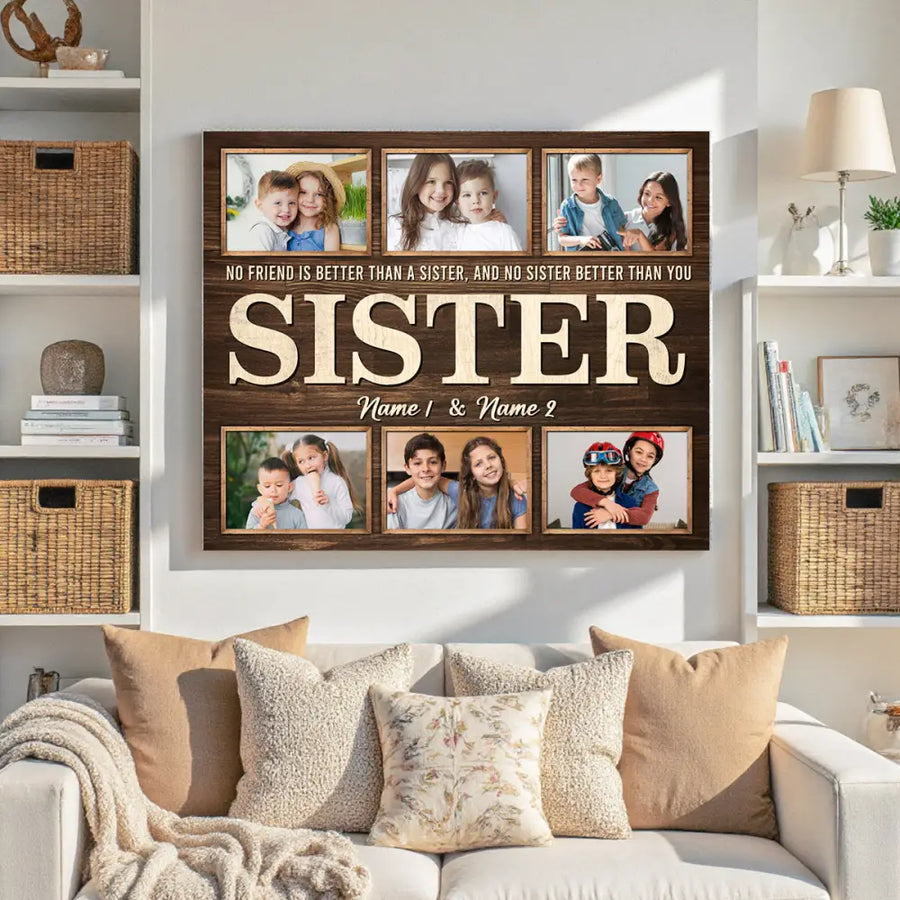 Celebrate your sister with this personalized canvas designed to highlight the special bond between siblings. Customize it with photos, names to create a heartfelt gift. Perfect for birthdays or Christmas, this meaningful present from a younger brother or younger sister will make her feel truly appreciated.