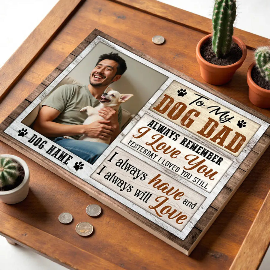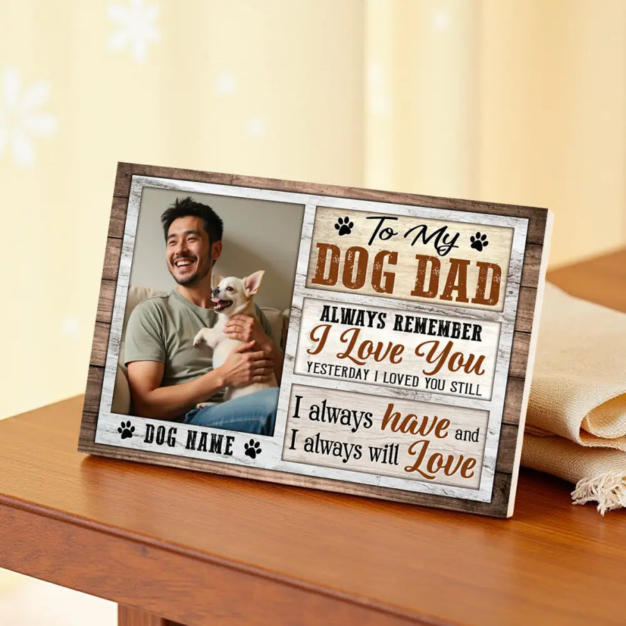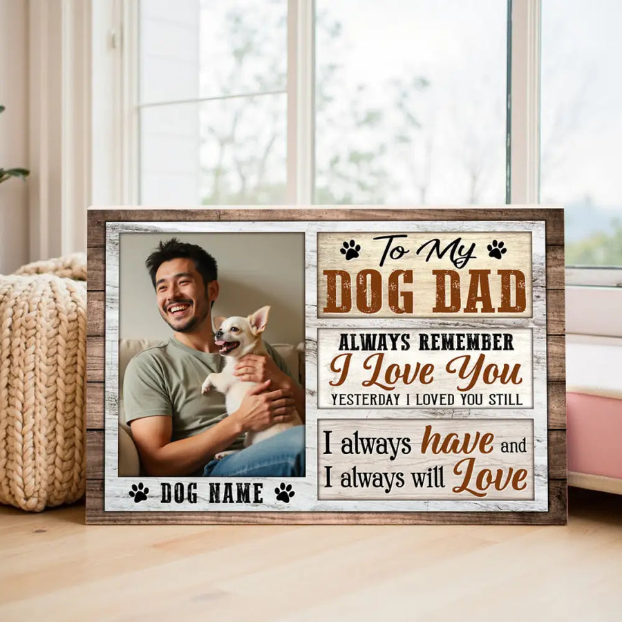 Show Dad how much he means to you with this heartfelt personalized canvas featuring the loving message To My Dog Dad Always Remember I Love You. A touching gift that celebrates the special bond between a dog and his favorite human, perfect for home, office, or any space filled with love.